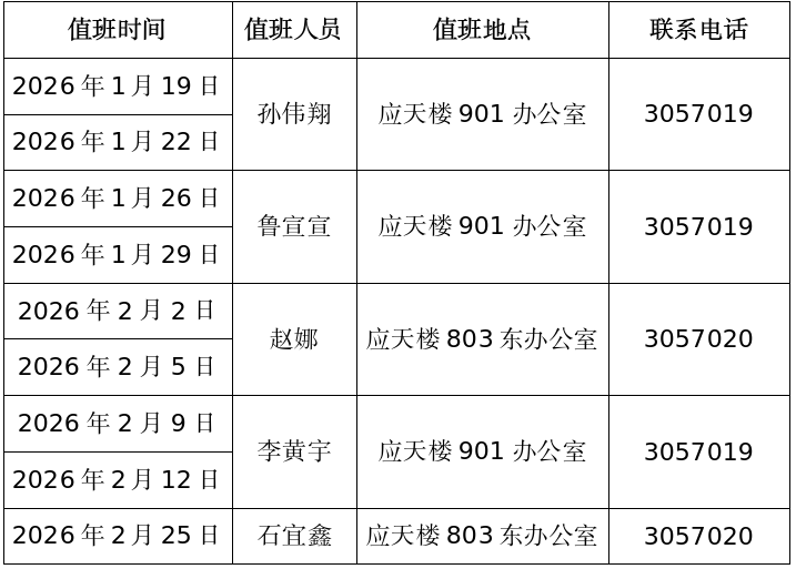 根据学校2025-2026学年校历安排,2026年1月19日开始放假,2月27日正式上班。为保障学校各部门和师生校友寒假期间查档需求,现将本馆2026年寒假值班安排通知如下: